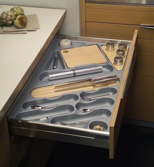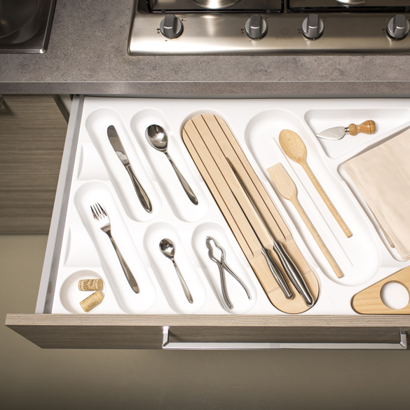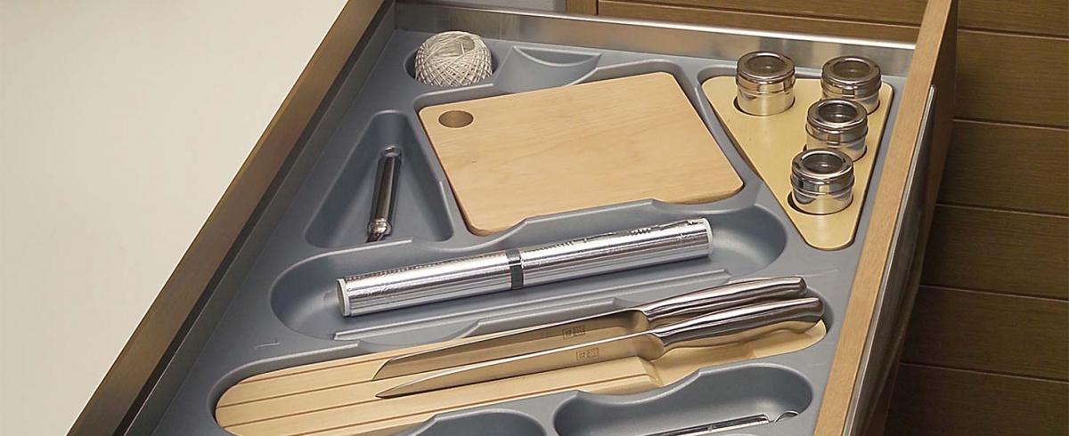 For a greater functionality the cutlery trays can be equipped with accessories available as optionals such as knife block, chopping board and spice tray.