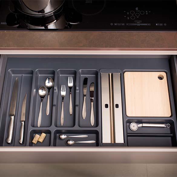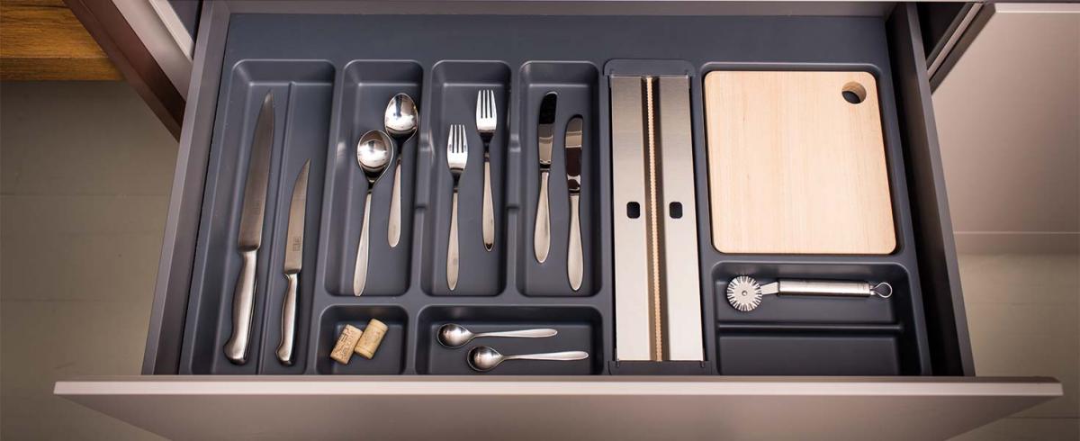 La nuovissima finitura grigio orione, infine, si adatta perfettamente alle più attuali e moderne tipologie di cassetti e sponde.
